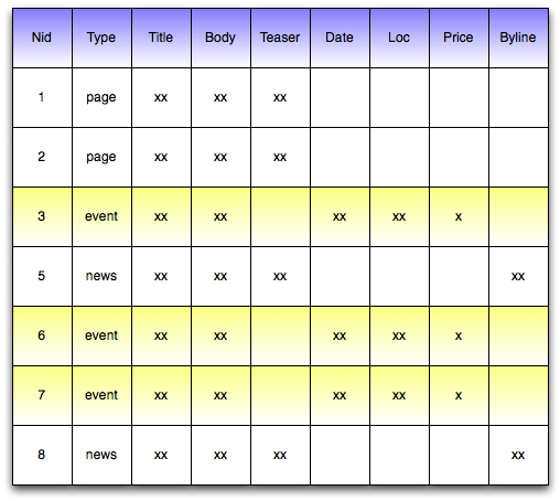 It helps to visualize the content in Drupal as a giant spreadsheet. That is not how it is stored, of course, but conceptually imagine all nodes in one giant table, with each column corresponding to a field. Some nodes will have data only in some columns/fields, depending on their type. (See Figure 2)